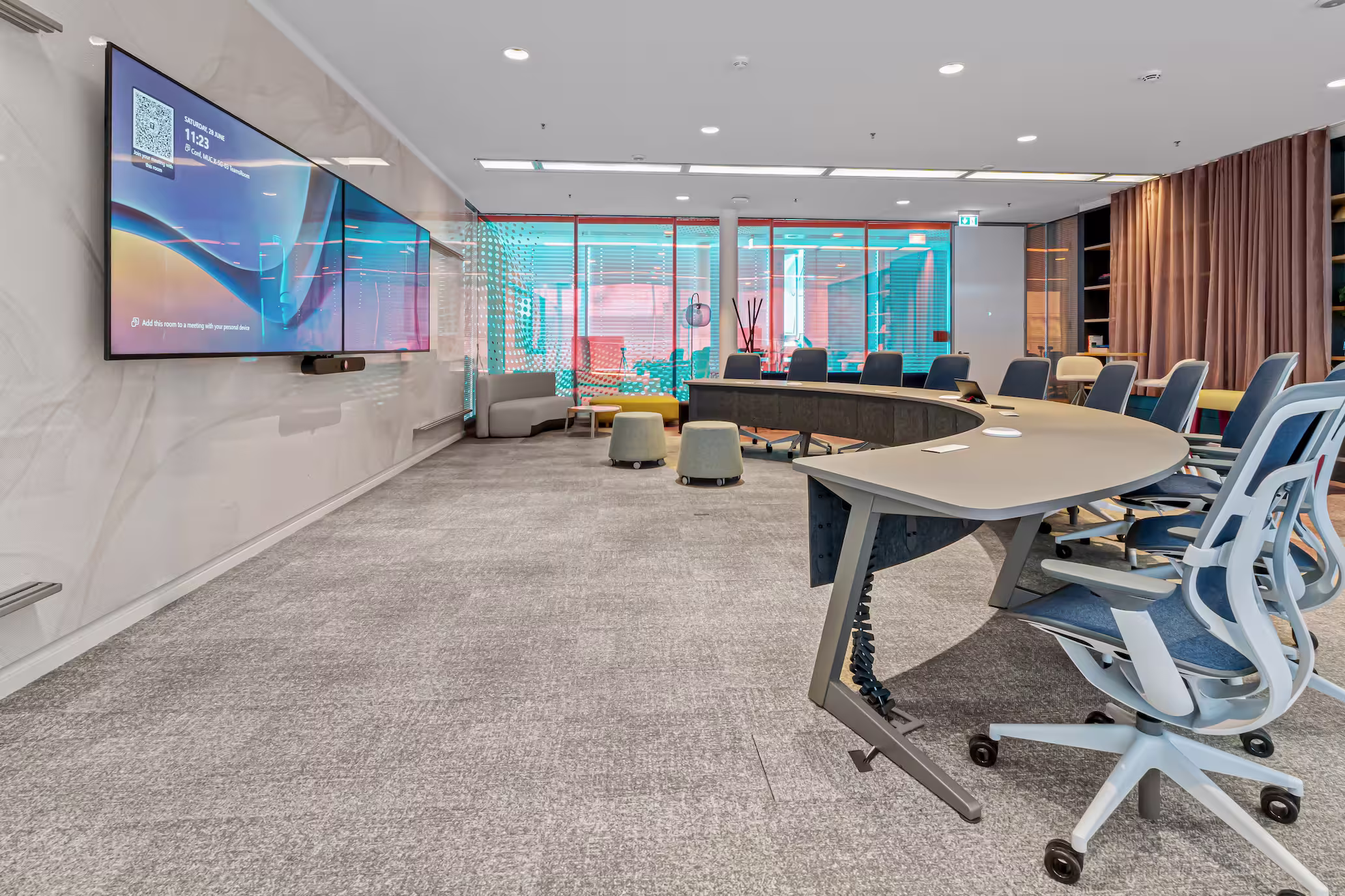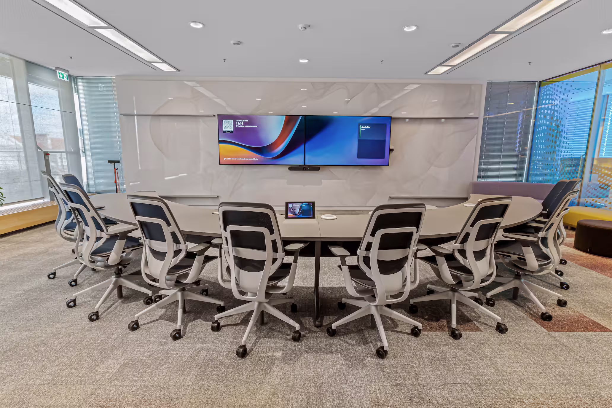 Das integrierte Microsoft Teams Rooms System mit Dual Screen Setup sorgt für eine klare Trennung zwischen Teilnehmerdarstellung und Präsentationsinhalten, wodurch Meetings strukturierter und natürlicher ablaufen. Hochwertige Audio- und Videokomponenten garantieren dabei eine ausgezeichnete Sprachverständlichkeit und eine authentische Bildwiedergabe. Das Ergebnis ist ein Meetingraum, der echte Nähe und Präsenz vermittelt – selbst über große Distanzen hinweg.